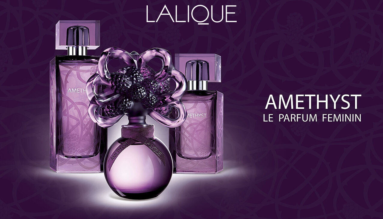 Lalique Amethyst is een vrolijke en verleidelijke damesgeur met een moderne, gestroomlijnde compositie. Een smakelijke mix van fruit en bloemen op een elegante muskus-en houtachtige basis. De floraal-fruitige geur werd in 2007 ontworpen. Misleidend openhartig, natuurlijk luxueus en gevaarlijk verslavend.